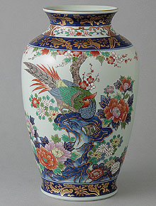 ◆ 肩丸花瓶 染錦岩花鳥 (有田焼)